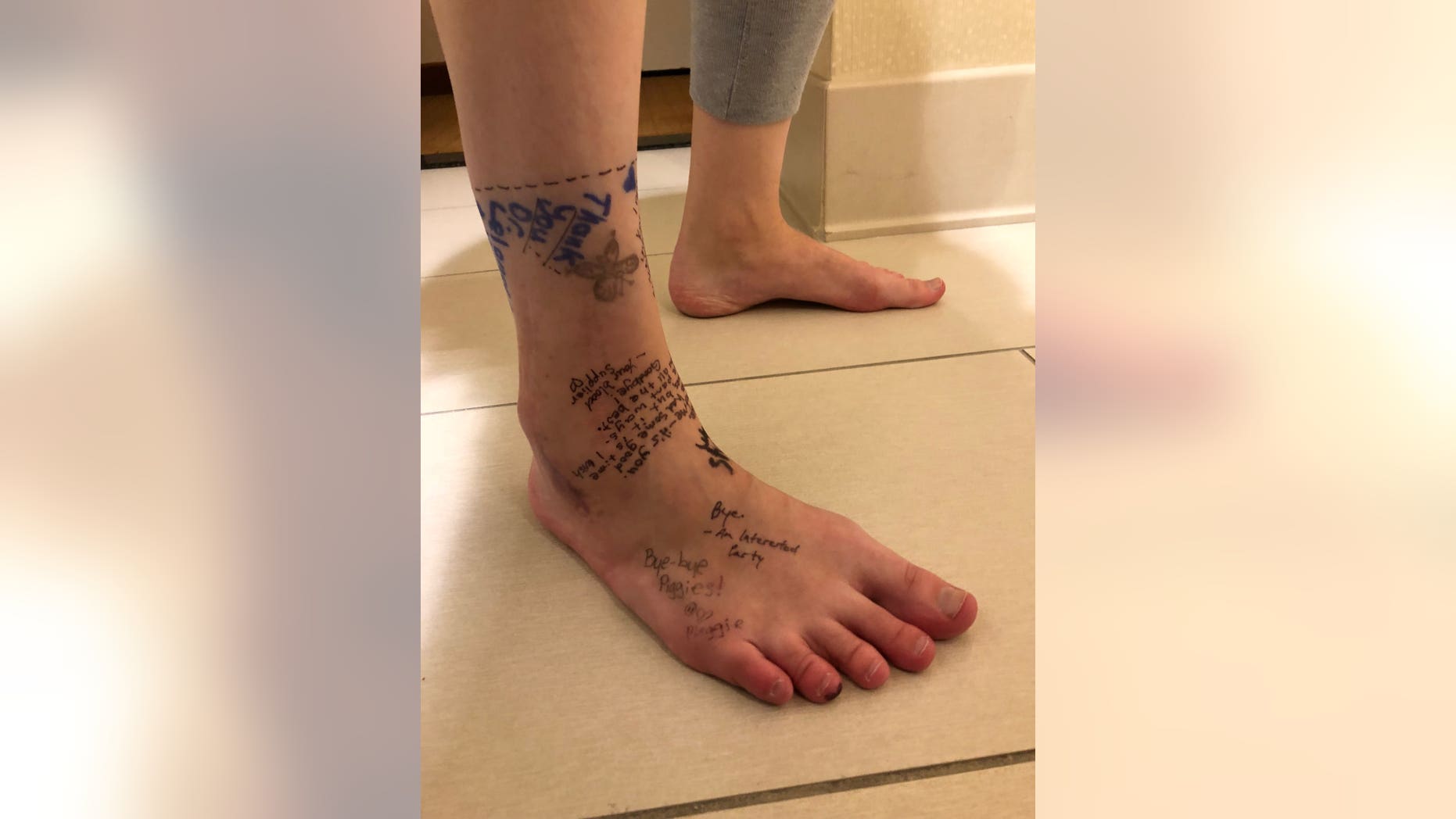 Before the amputation, Jordan Beckwith scribbled a note on her leg to say goodbye to her right foot.